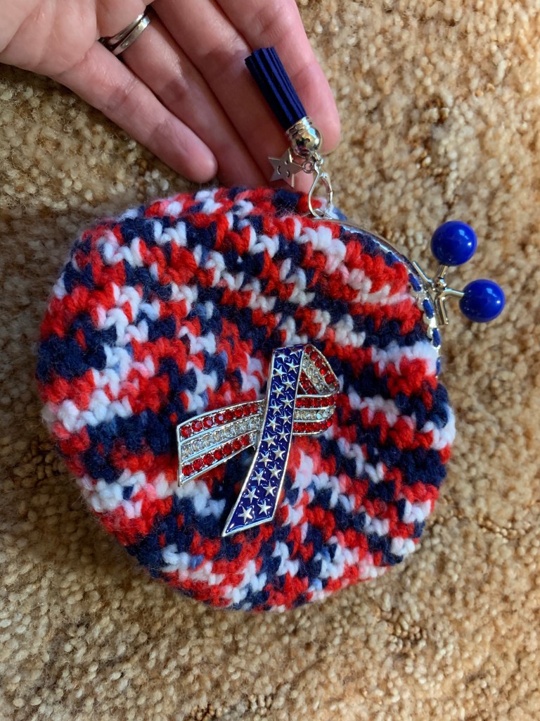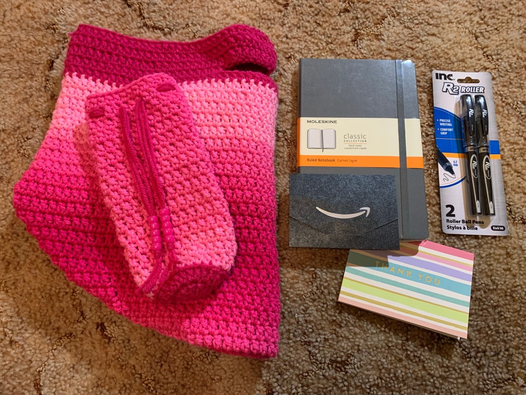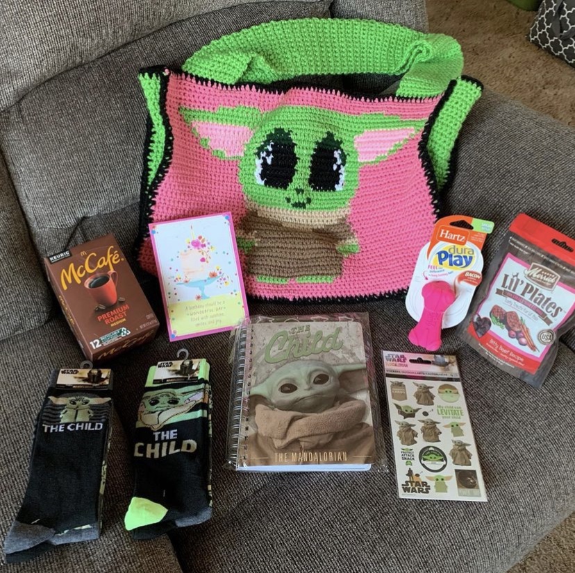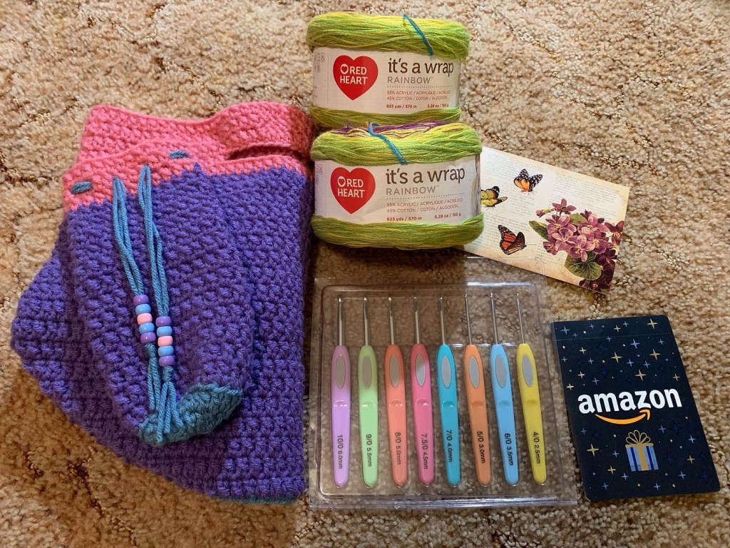Yoda Crochet Tote Bag, McDonalds Coffee, Yoda Socks, Handwritten Card, Yoda Journal and Stickers, Dog Toy and Treats. USA Inspired Crochet Tote Bag and Matching Case, Gifted with the USA Tumbler Cozy Below, and also a $10 Amazon Gift Card. USA Crochet Tumbler CozyCrochet USA inspired Coin Purse with USA Ribbon Pin, $25 Macys Gift Card, and Handwritten Card. A Closer Look at the USA inspired Coin Purse. Crochet Tote Bag with Matching Case, Moleskin Journal, $15 Amazon Gift Card, Pens, and a Handwritten Card. A Closer Look at the Crochet Tote Bag and Matching Case. Crochet Tote Bag with Matching Case, Redheart It’s A Wrap Yarn, Crochet Hook Set, $15 Amazon Gift Card, and a Handwritten Card. A Closer Look at the Crochet Tote Bag and Matching Case.