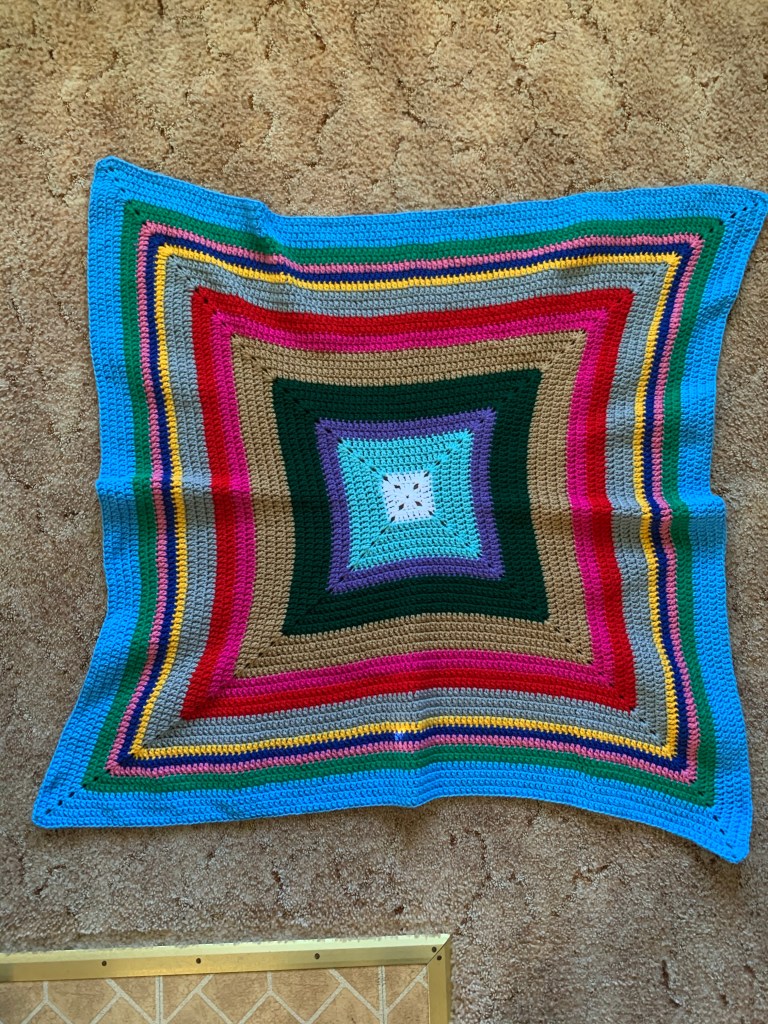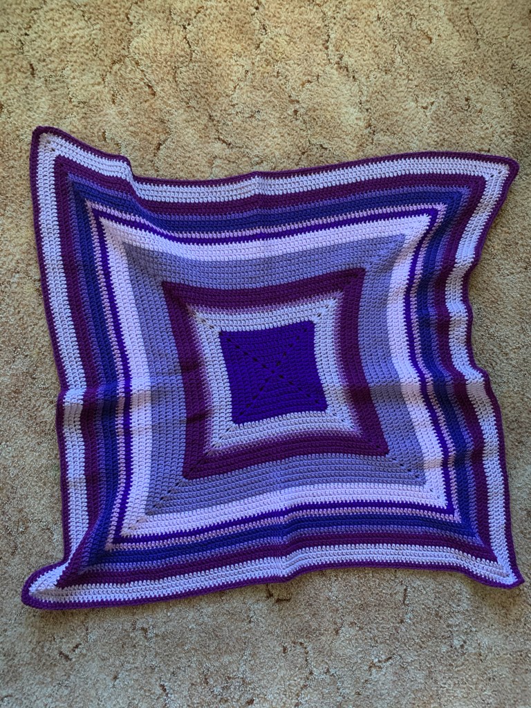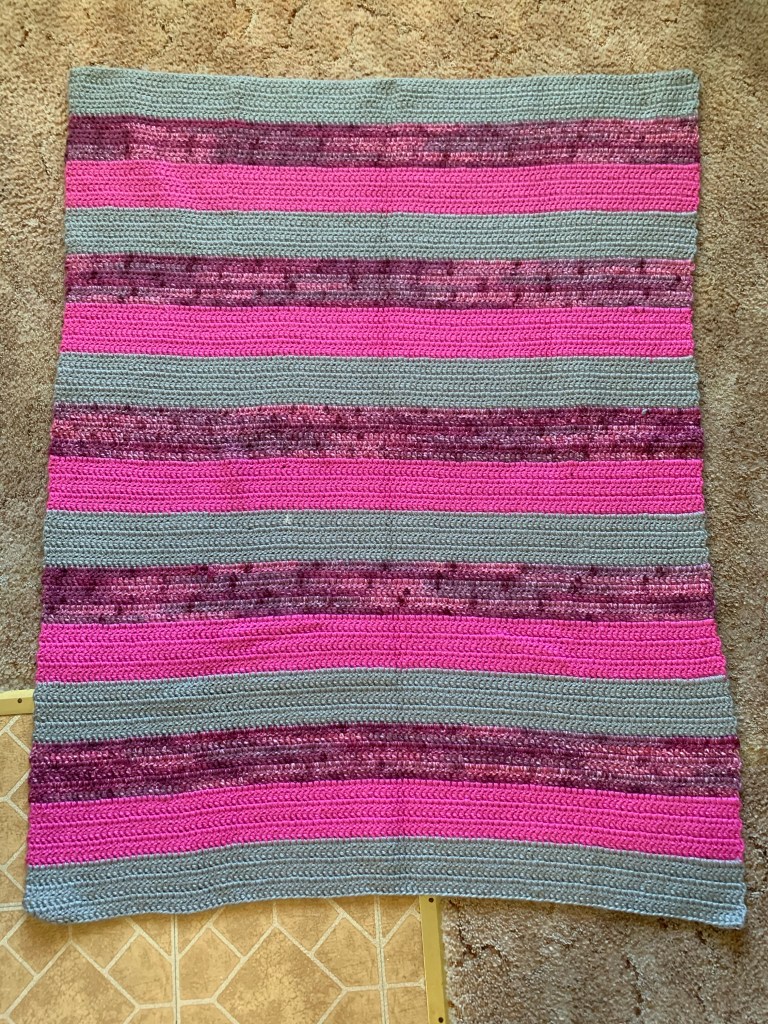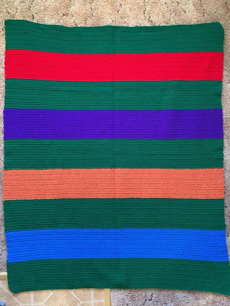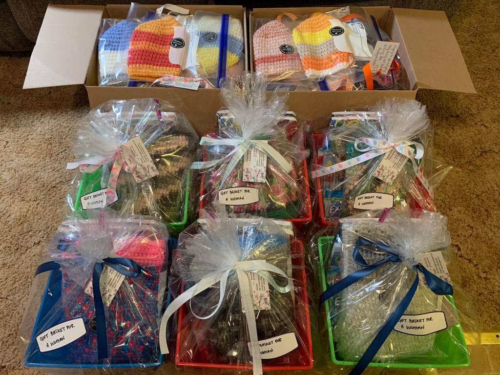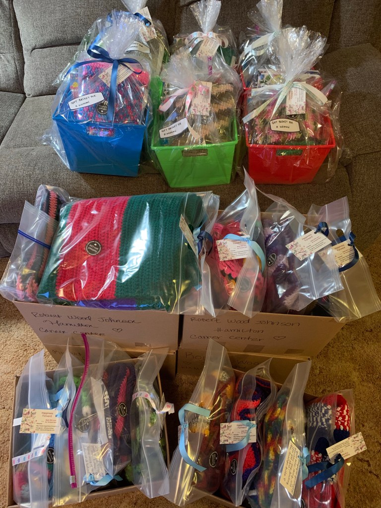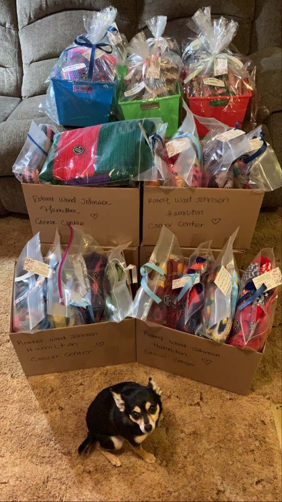 Also, on this Donation drop off to The RWJ Cancer Center, I included handmade crochet items, all made by me. Altogether I made 32 chemo hats, 1 hat and scarf set, 4 shawls, and lap blankets. Below I will include pictures of the lap blankets, and the gift baskets. I didn’t get to take pictures of all of the items this time, I apologize, but I hope that this post gives you inspiration to donate items and some ideas for donations or gift giving.
