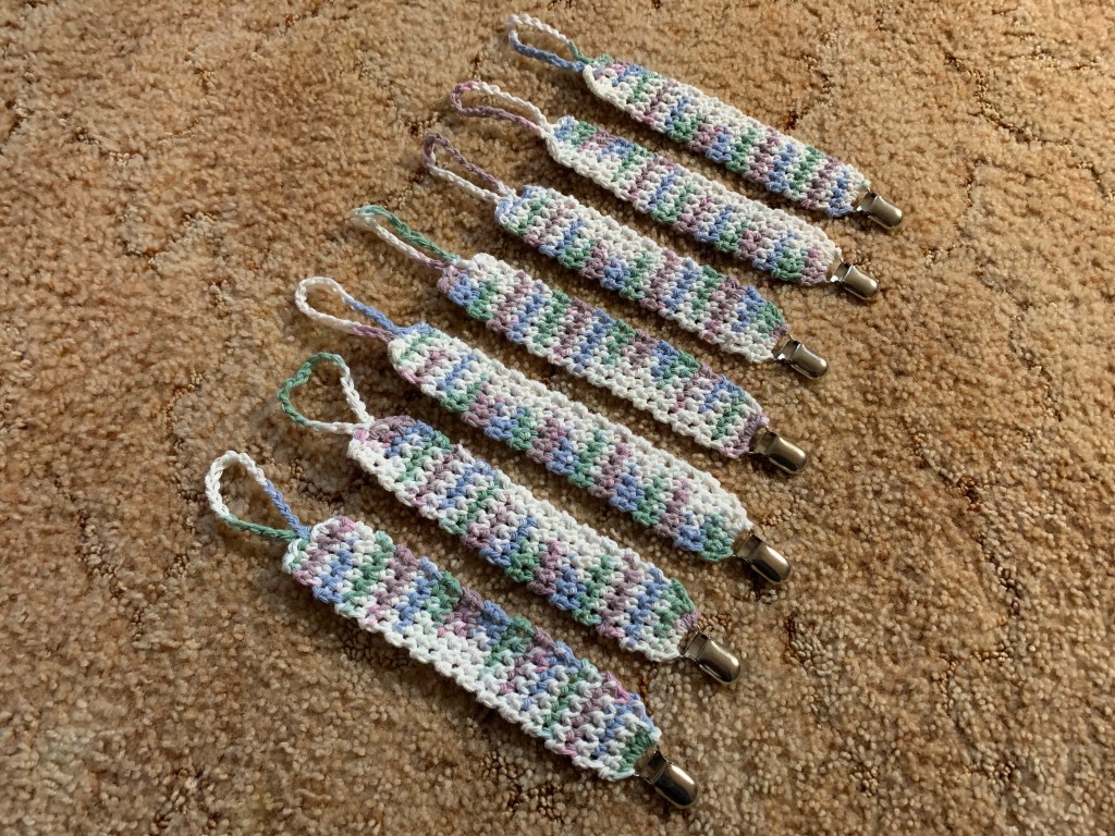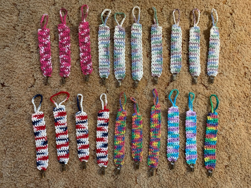 40 Handmade Valentine’s Day Cards for Soldiers’ Angels – Cards Plus Group, Sent to Veterans Hospital in Florida. Handmade Valentine’s Day Cards.Handmade Valentine’s Day Cards. Crochet Pacifier Clips, for Soldier’s Angels, Sewing and Crafting Group. I used all cotton yarns and clips are from Amazon. No Pattern, just all single crochet and I made a loop on the top to attach to pacifier. Crochet Pacifier Clips. Crochet Pacifier Clips. Crochet Pacifier Clips. Crochet Pacifier Clips. Crochet Pacifier Clips. Crochet Pacifier Clip. Gifts for Woman of Valor, Woman Caregiver. Handwritten Card, Wax Melts, $25.00 Starbucks Gift Card, and Crochet Throw Blanket. Crochet Throw Blanket for Woman of Valor, for Soldier’s Angels. I used 100% worsted weight 4 acrylic yarns. Crochet Blanket is done in all double crochet with double crochet border.