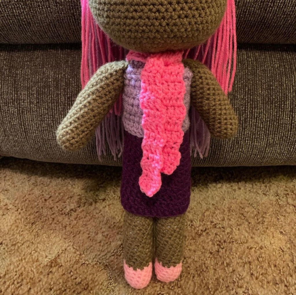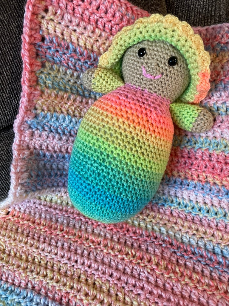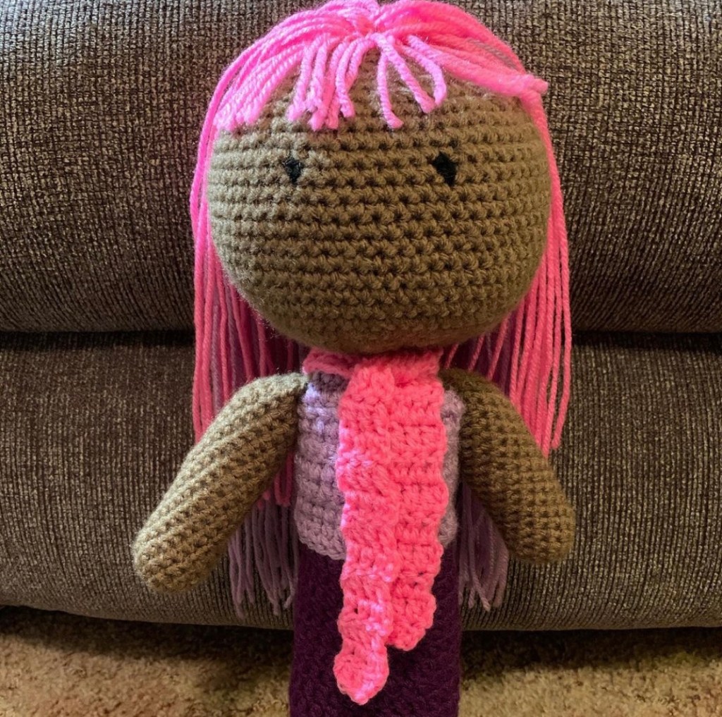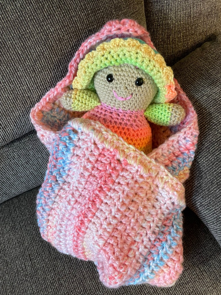 Hello Friends, I wanted to share pictures of the first Crochet Amigurumi that I have ever made. (In the past, I have made a Crochet Doll and Monster, that were requested by a friend for her two children, I’ll add pictures below, but I didn’t follow a pattern.) I saw this Swaddle Baby Amigurumi on my crochet friends YouTube Channel, it was just so cute, and I really wanted to try my hand at it. The pattern is available on Etsy and is by Valerie Phillips (ValeriesCuddlyCat). Her pattern is very easy to follow, very well written, and affordable! I highly recommend if you’re new and even old to crochet Amigurumi. The Swaddle Baby is such an adorable and great pattern! I love how mine came out and I have already gifted to a friend. I also made a little swaddle blanket to go along with the doll. I hope that you enjoy the pictures! Thank you so much for supporting my blog and following along! I hope that all of you have a wonderful day!