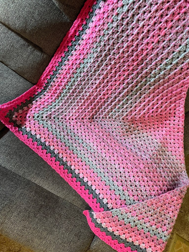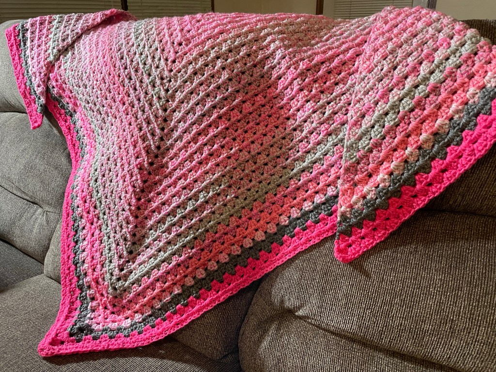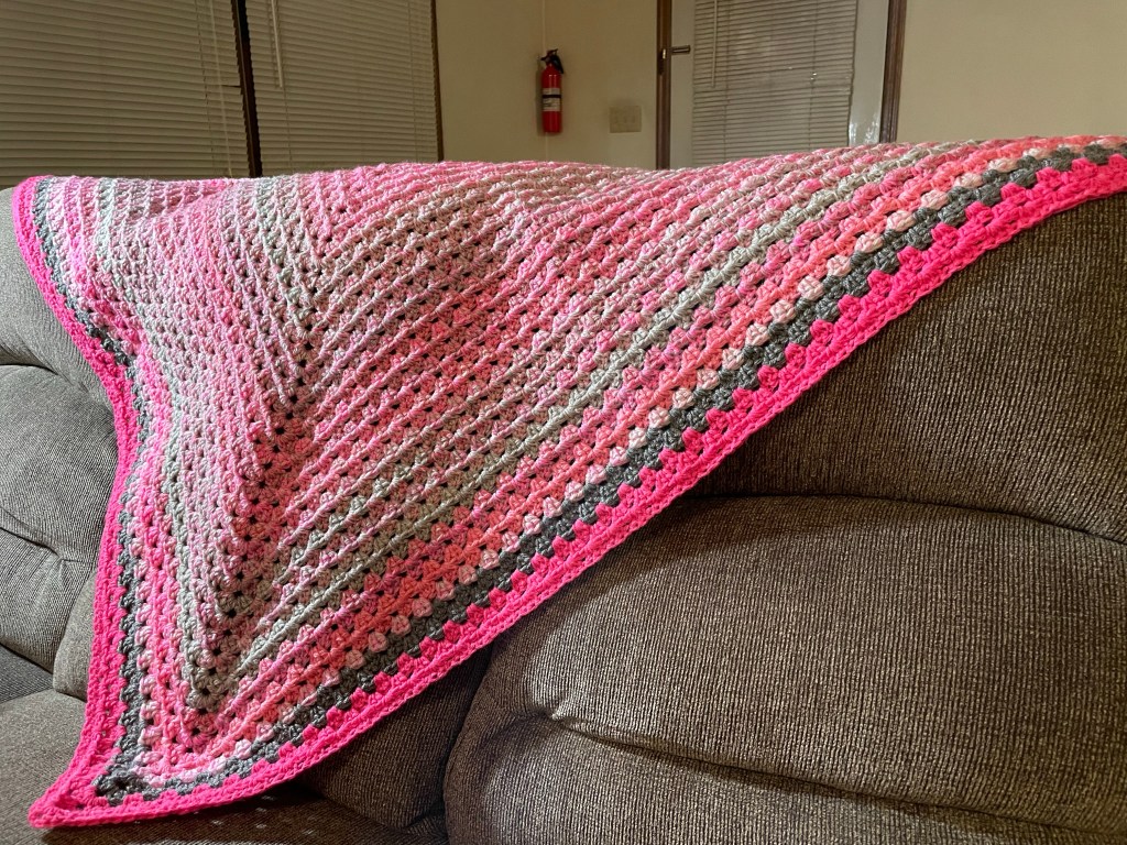 Hello Friends, Today I wanted to share with you two shawls that I crocheted and donated recently to the charity, Wrapped In Love, here in my state of New Jersey. Wrapped In Love donates handmade shawls, blankets, and other items to family members of loved ones who have passed away and have given the gift of an organ/tissue donation to someone else which most likely saved that person’s life. I happened to find this charity when I was looking for more local places to donate my crochet work here in New Jersey. I’m so thankful for this opportunity and that I was able to make shawls for this organization. Both crochet shawls are made with the crochet pattern by Claire – her YouTube Channel is CrochetWithClaire. I just love her shawl pattern ‘Rainbow Granny Stitch Shawl,’ it’s a very beginner friendly pattern, works up pretty fast, and you can make in any colorway that you love! Below I will share pictures of the two crochet shawls that I made and donated to Wrapped In Love. The pink shawl is made with 3 Cakes of Redheart Roll With It Yarn in the ColorWay ‘Popular Pink,’ and also solid worsted 4 weight acrylic pink and gray yarns for the edging. The other shawl is made with 3 Cakes of Hobby Lobby Yarn Bee SugarWheel Yarn in the ColorWay ‘Honey Bunch.’ I think both shawls came out so beautiful! I hope that these shawls bring their recipients lots of love, comfort, and even a smile during some of the hardest times that they’re facing. Remember any act of kindness, no matter how small, can change a person’s life and make their day better in ways that we may never even know. Thank you so much for always following along in reading my blog and for all of your love and support! I love helping others and I’m so thankful to be blessed with my crochet talents and for the work that I’m able to do with it. I hope that all of you have a wonderful day and be back soon for more blog posts!