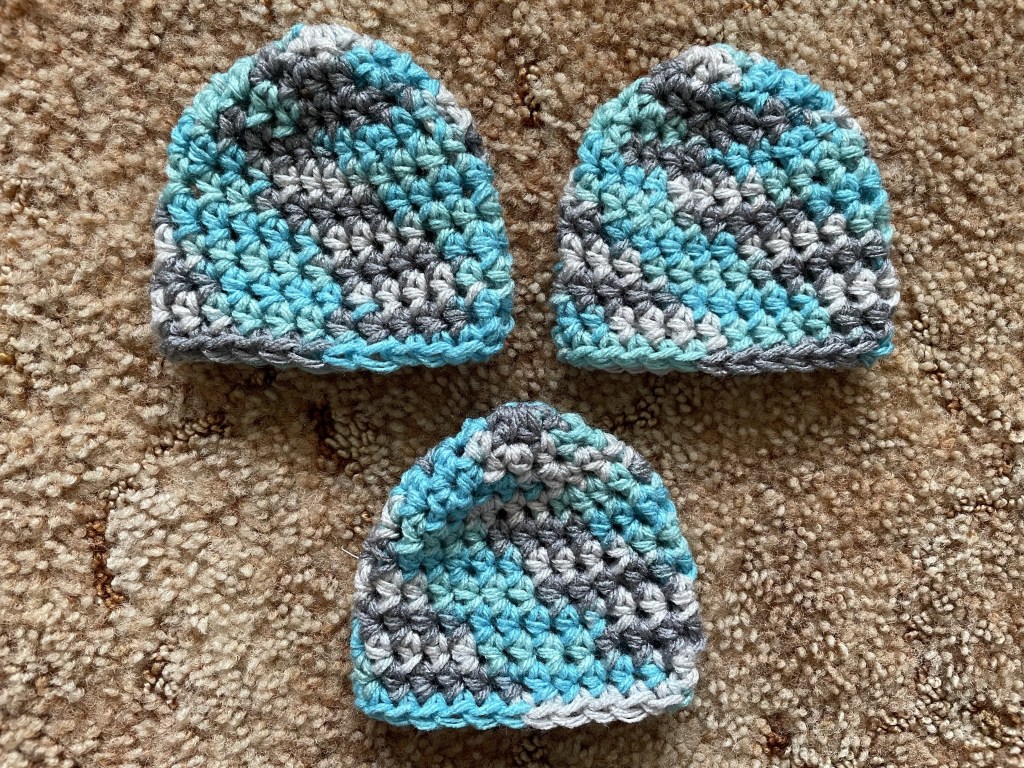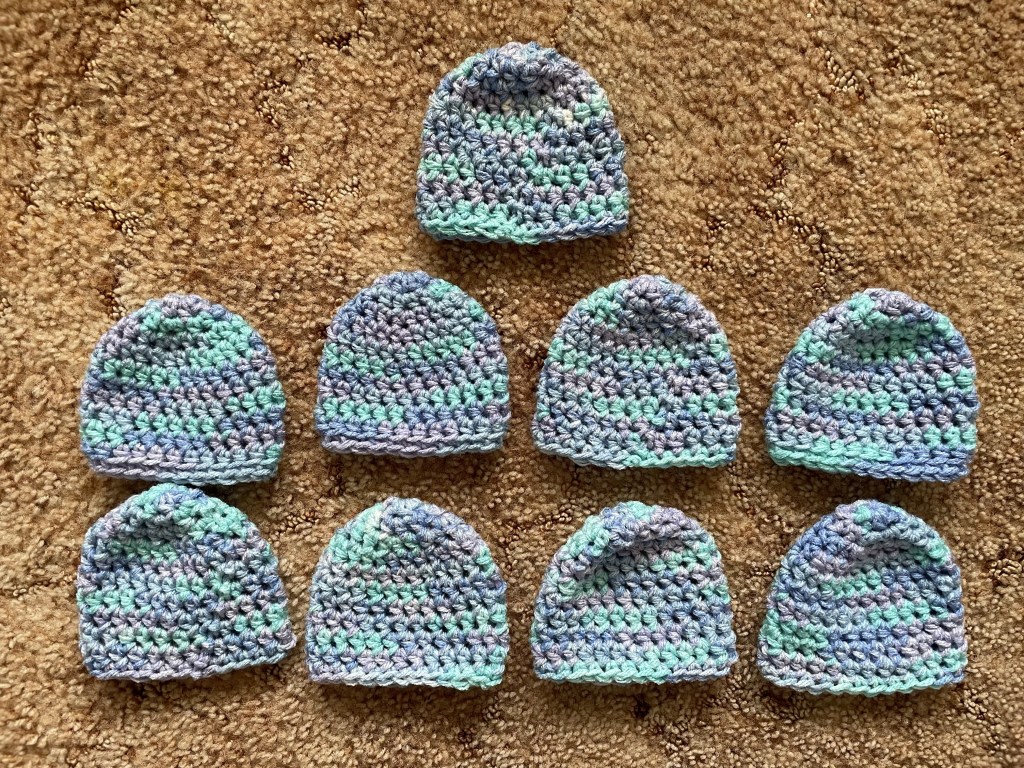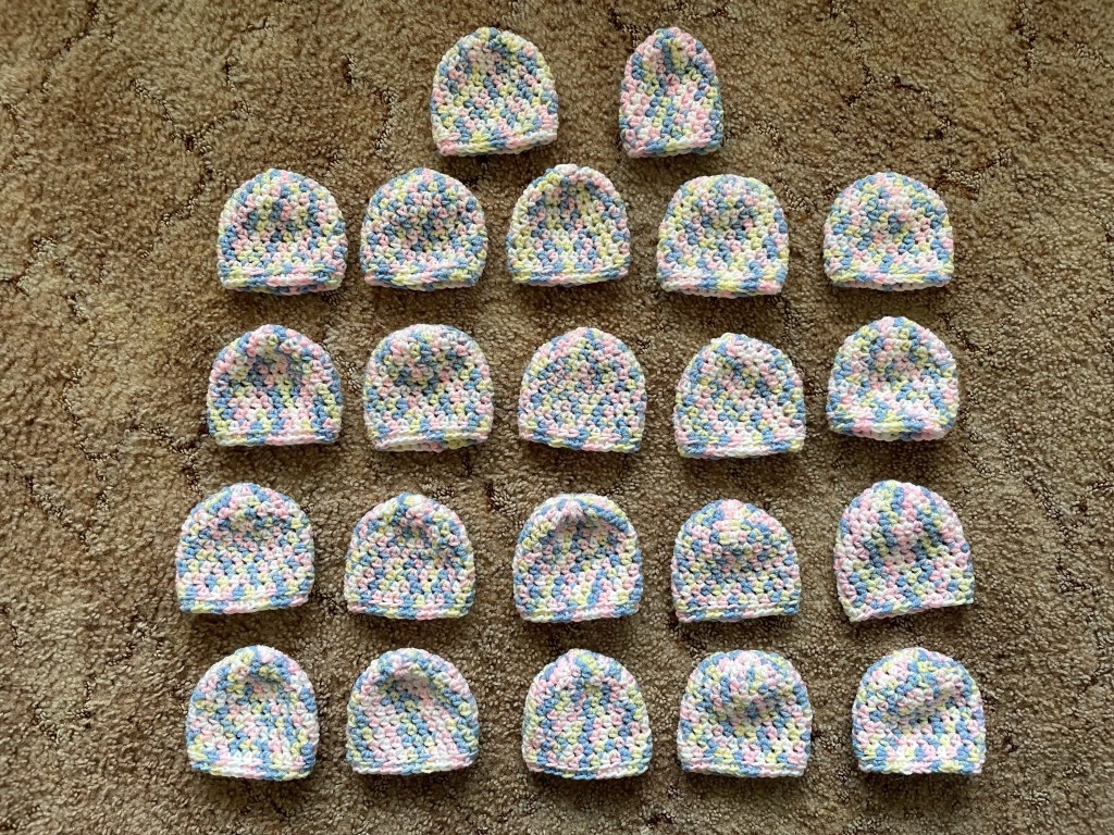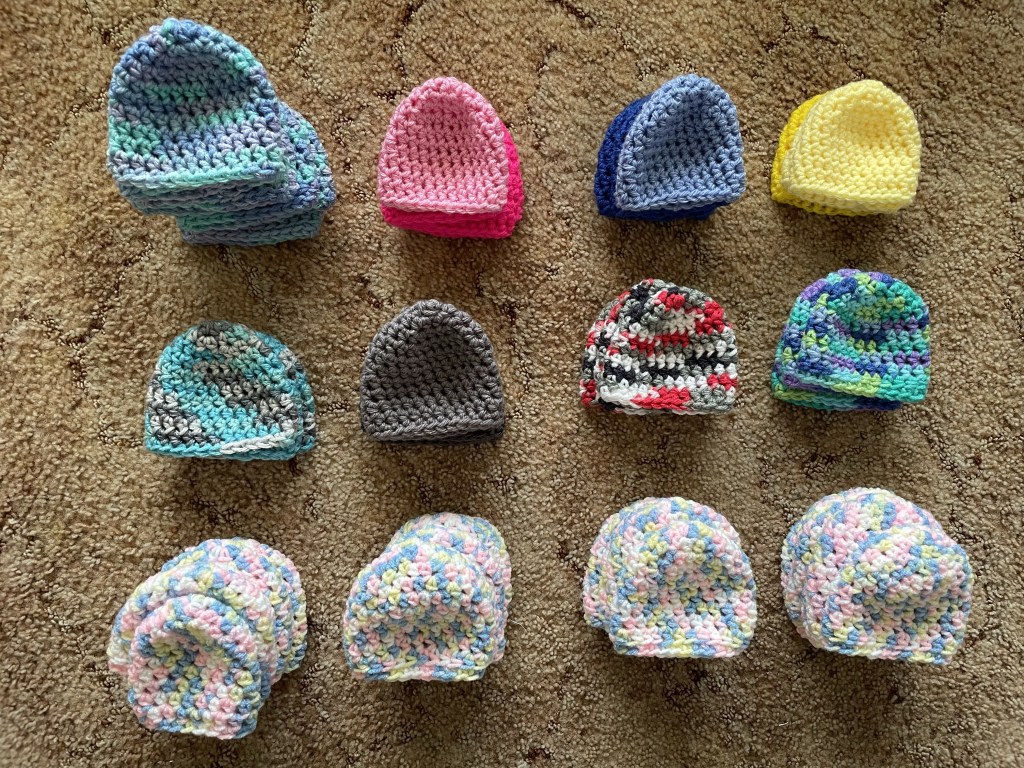 Hi Friends, today I wanted to share with you Preemie Baby Hats that I made for The Babies in a Texas NICU. My Crochet Friend Terri, Her YouTube Channel is ‘YarnJoy Podcast,’ crochets character hats for the babies in a Texas NICU each year, she’s been doing this for several years now. This year, I thought that I would make some beanies for The Preemie Babies at the NICU to help her with her yearly donations of baby hats. I crocheted 55 Preemie Hats in Total! I used 100% Worsted 4 Weight Acrylic Yarns (Scrap Verigated and Solid Colors that I had left over from other crochet projects). I used Boye H & I crochet hooks to make the sizes bigger and smaller. The crochet pattern I used is a free crochet preemie baby hat pattern from Kylee Keller, her Blog and Instagram are ‘okiegirlblingandthings.’ I will link her website below to this Crochet Preemie Baby Hat Pattern. This Preemie Baby Hat Pattern is very beginner friendly, very easy, and works up really fast! You can make many hats in just one sitting! I’m also sharing a picture below of 5 Crochet Preemie Baby Blankets that I made several years ago for the same NICU in Texas. I used Lion Brand Baby Yarns and a Boye Crochet H Hook to make them. I just used simple crochet granny square & double crochet patterns (I believe the crochet preemie baby blankets measured around 19 to 21 inches squared (length and width). I enjoyed making this Preemie Baby Hats and Preemie Baby Blankets and I hope that they bring the babies and their families a lot of comfort, happiness, and love.